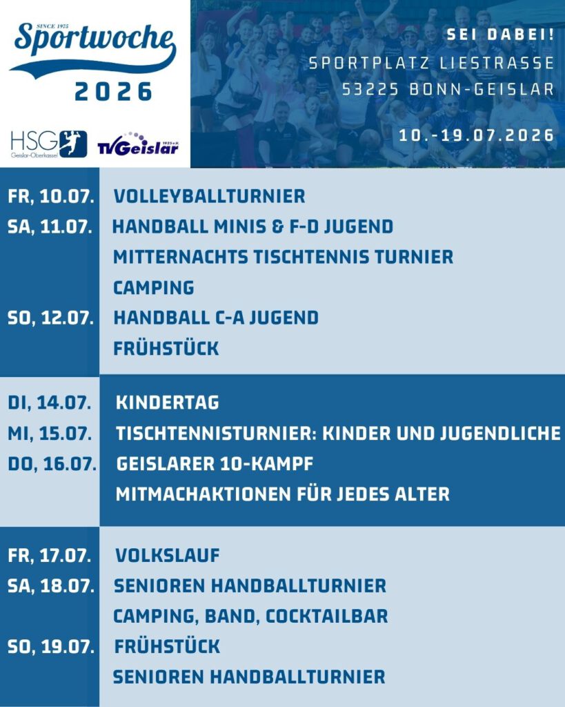Sport, Spaß & Gemeinschaft. Es ist wieder so weit! Der TV Geislar lädt vom 10.07.2026 bis zum 19.07.2026 ein zur traditionsreichen Geislarer Sportwoche. Freut Euch auf spannende Wettkämpfe, schweißtreibende Herausforderungen und ein geselliges Miteinander für alle Sportler und das gesamte Dorf. Egal ob aktiver Sportler oder begeisterter Zuschauer – bei uns findet jeder seinen Platz auf oder neben dem Spielfeld.